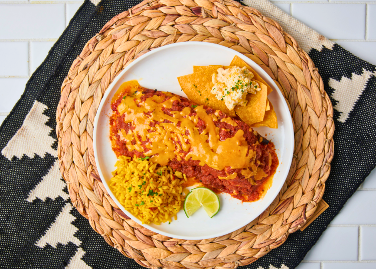 chicken + onions + peppers + enchilada sauce + shredded cheddar + corn tortilla + lime + cilantro
