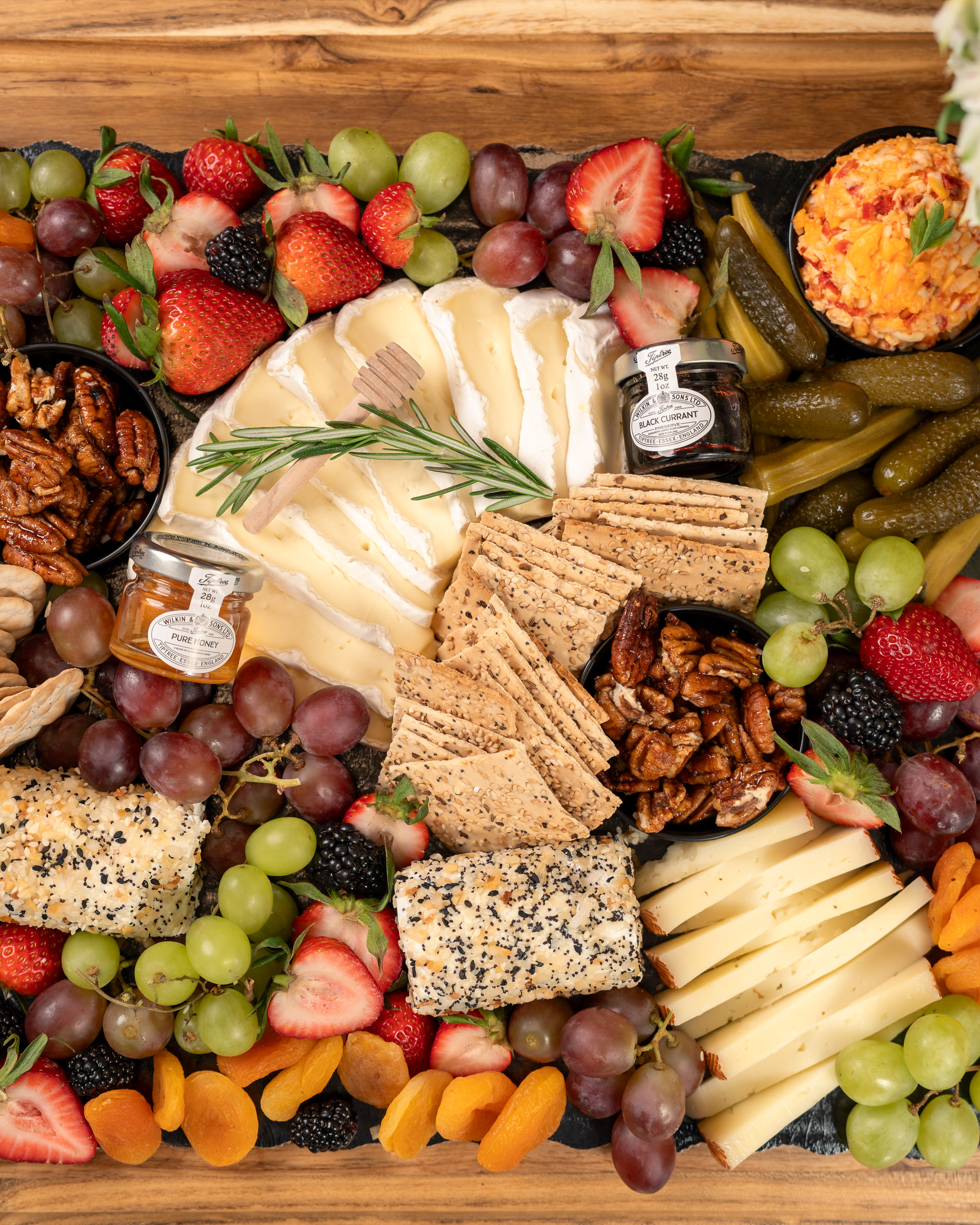 Board features assorted cheeses, charcuterie, specialty crackers, assorted fruit, and signature garnishes.