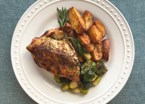roasted brussels sprouts, roasted potatoes, yeast rolls