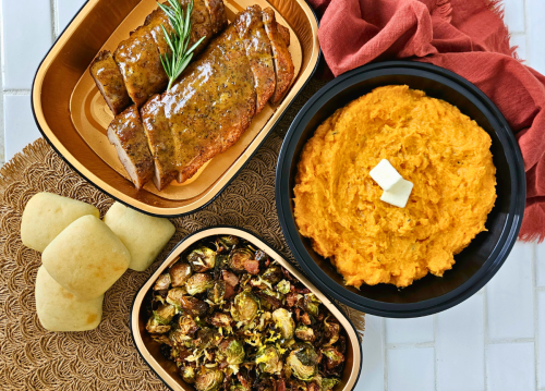 Brussels sprouts, whipped sweet potatoes, yeast rolls