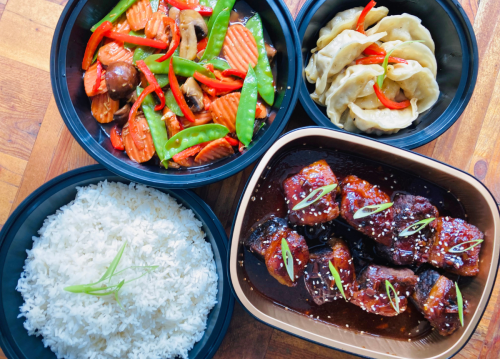jasmine rice, snow pea & carrot stir fry, dumplings